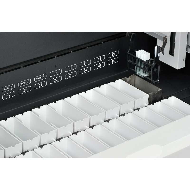 染色站點(diǎn)數(shù)量 總站點(diǎn)數(shù)26個,(含試劑站點(diǎn)17個,水洗站點(diǎn)4個,烤缸1個,加載/卸載站點(diǎn)≥4個(智能配置,其中2個缸可設(shè)置為試劑缸) |