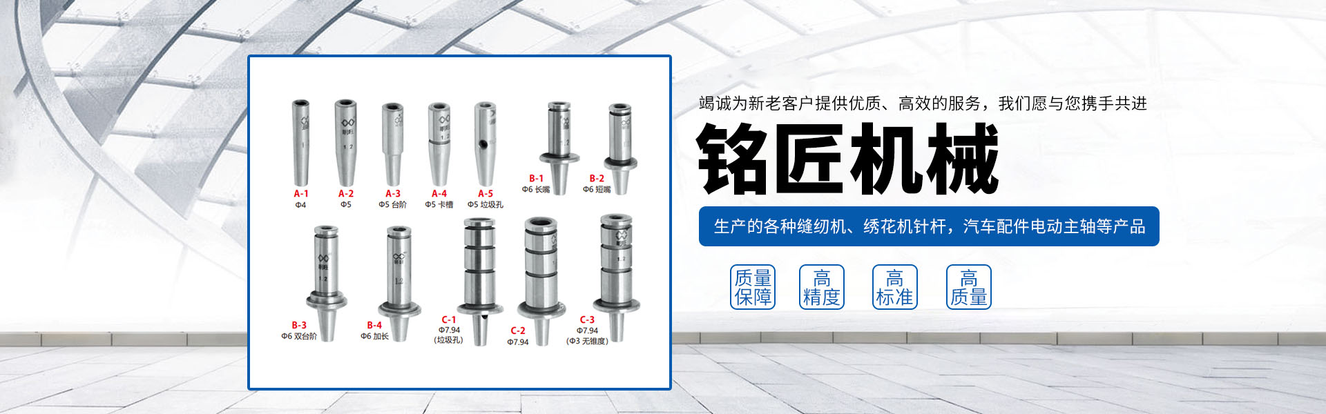 由本廠(chǎng)生產(chǎn)的各種縫紉機(jī)、繡花機(jī)針桿,汽車(chē)配件電動(dòng)主軸,以及使用于紡織機(jī)、皮革機(jī)、傳真機(jī)、印刷機(jī)、鞋機(jī)、眼鏡片磨機(jī)等各種機(jī)床上的軸套類(lèi)配件產(chǎn)品,以其高標(biāo)準(zhǔn)、高精度、高質(zhì)量的特點(diǎn),頗受客戶(hù)信賴(lài)。